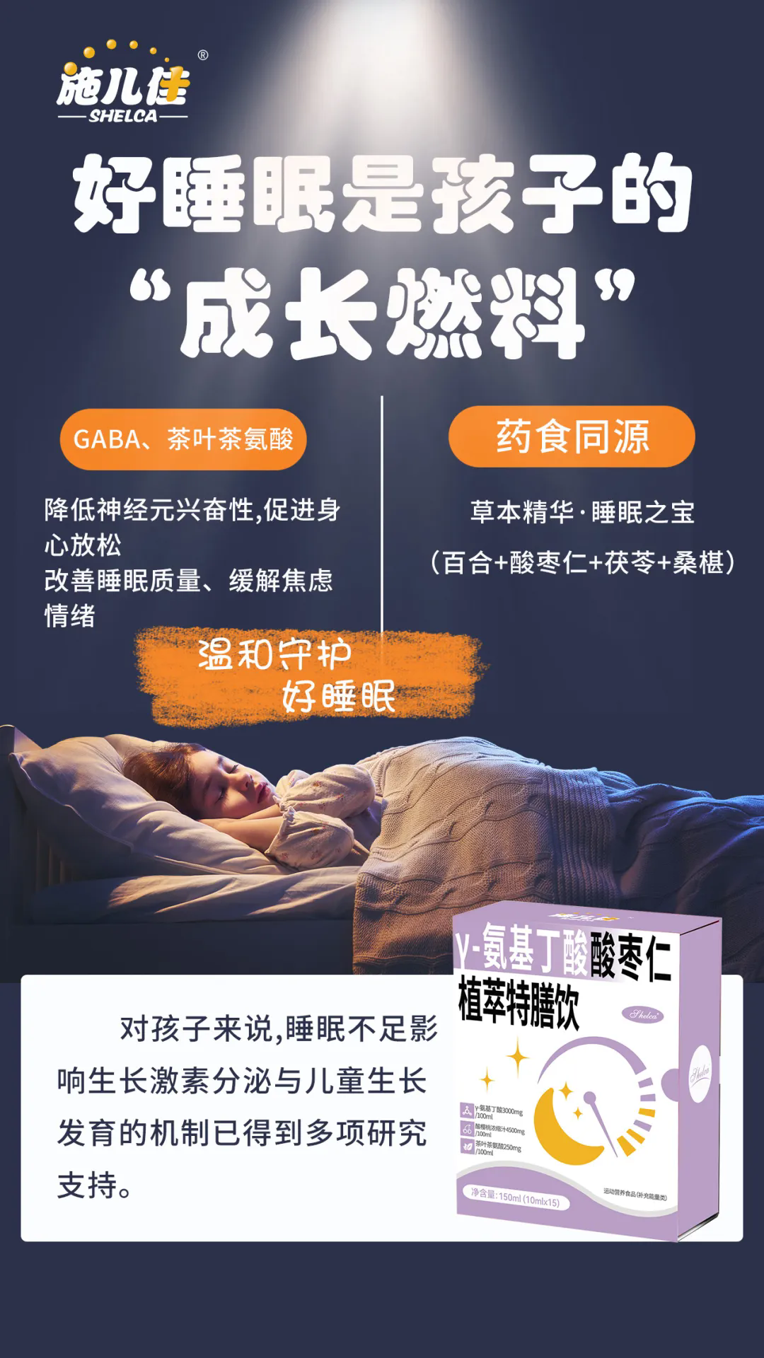 施儿佳Y-氨基丁酸酸枣仁植萃特膳饮,它从镇静神经、促进内源分泌、放松情绪、调节肠道、校准生物钟五个维度,由内而外,层层递进,为孩子打造自然而然的深度睡眠环境。